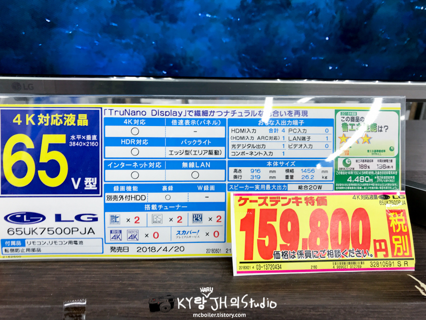 레코더를 따로 사서 달기로 하고 결국 최종 후보였던 65UK7500PJA를 빅카메라에서 구입했습니다.