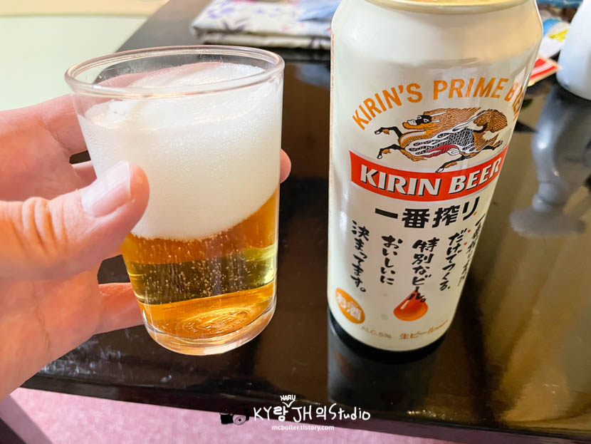 하루랑 1시간 정도 목욕을 즐기고 난 뒤에 방에 돌아오니 하루 아빠는 맥주를 마시고 있었는데 행복해 보이는 빨간 얼굴을 하고 있었습니다.