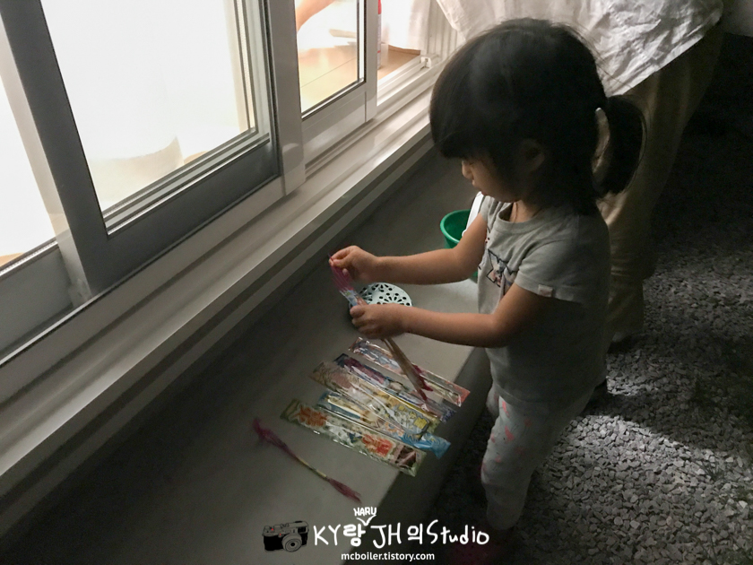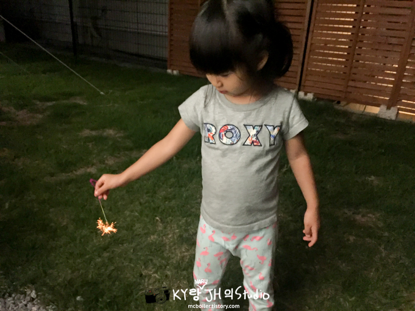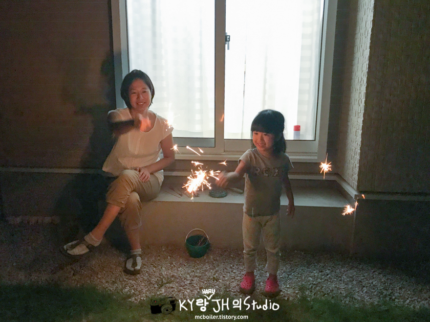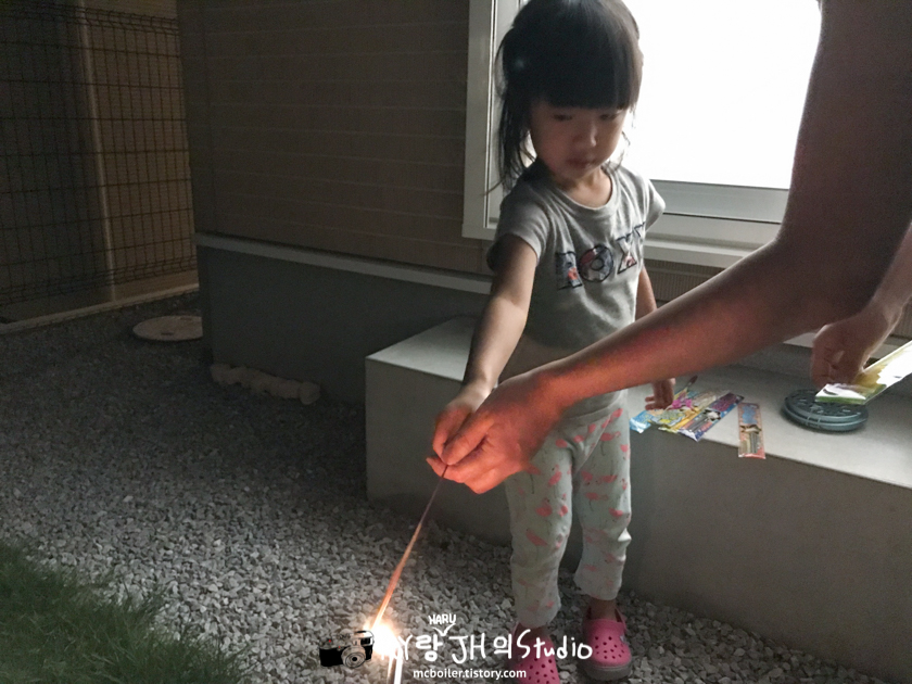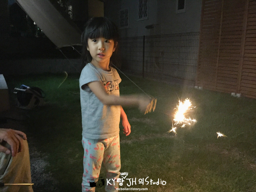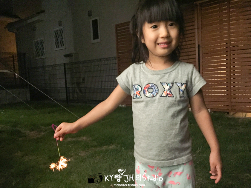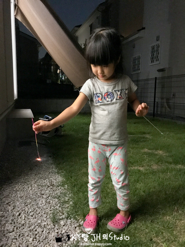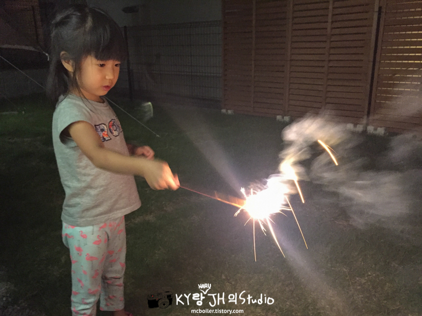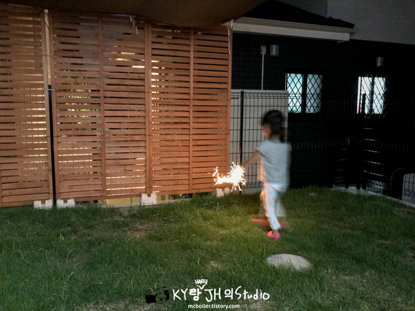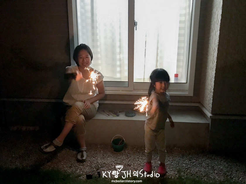 이날 사 온 불꽃 놀이 중 가장 센 불꽃놀이도 재미있다고 들고 뒤 뜰 안을 뛰어다녔습니다. ㅎㅎㅎ