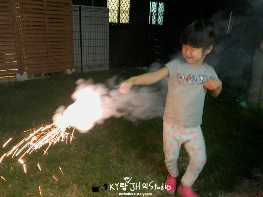 어느 정도 익숙해진 거 같아서 다음 단계로 조금 더 화력(?)이 강한 불꽃놀이를 하루 손에 쥐어 줬습니다