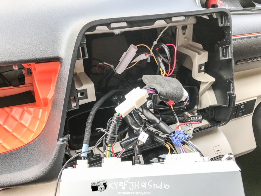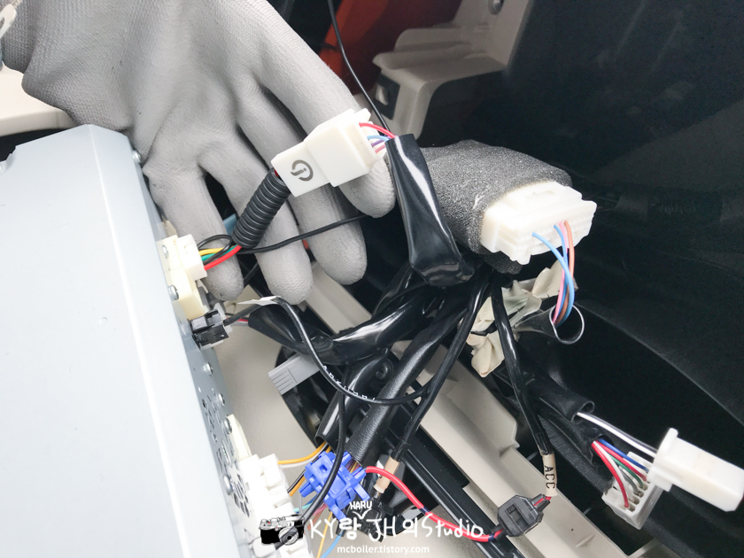장착은 아주 간단하게 아래 사진처럼 내비게이션과 차량 사이의 신호 케이블 사이에 커넥터로 이어 주기만 하면 끝!!!