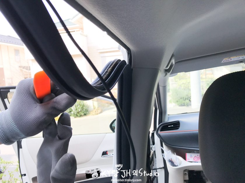 뒤쪽부터 고무 패킹을 전부 분리하고 그 사이로 케이블을 살살 밀어 넣고 패킹을 다시 밀어 넣으면서 조수석으로 향합니다.