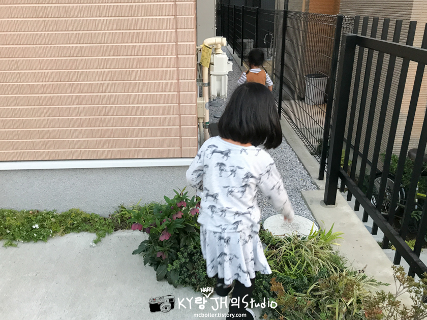 초밥을 먹고 집에 돌아왔더니 하루와 동갑인 옆집 아이가 저희 집 뒷 뜰에 놀러 와서