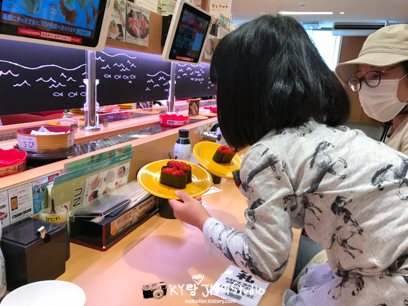 벚꽃 구경을 마치고 나서는 하루가 좋아하는 날치알 초밥을 사주러 회전 초밥집에 들렀습니다.