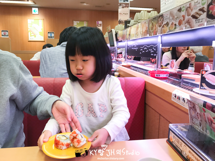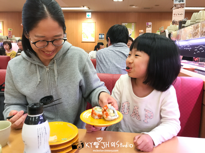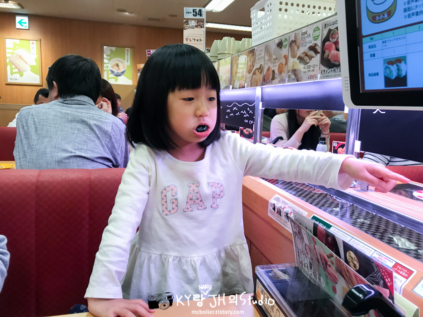 하루가 좋아하는 날치알 초밥을 먹으러 또 회전 초밥집에...