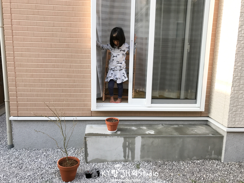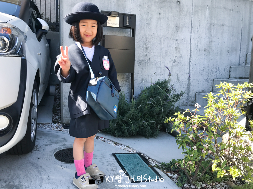 다음날은 날씨가 개어서 전 날 비가 와서 집 앞에서 못 찍었던 기념사진을 유치원 가기 전에 집 앞에서 찍고 나서 유치원 버스를 타러 갔습니다