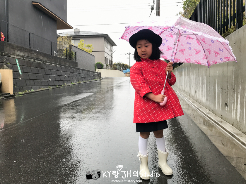 유치원 버스가 오는 집근처의 모임 장소까지 엄마가 사준 우산을 들고 갔습니다