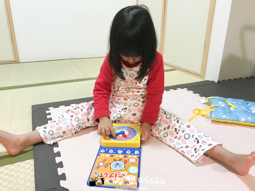 집에 돌아와서는 4살 생일 선물로 시계 공부 놀이 세트를 줬습니다
