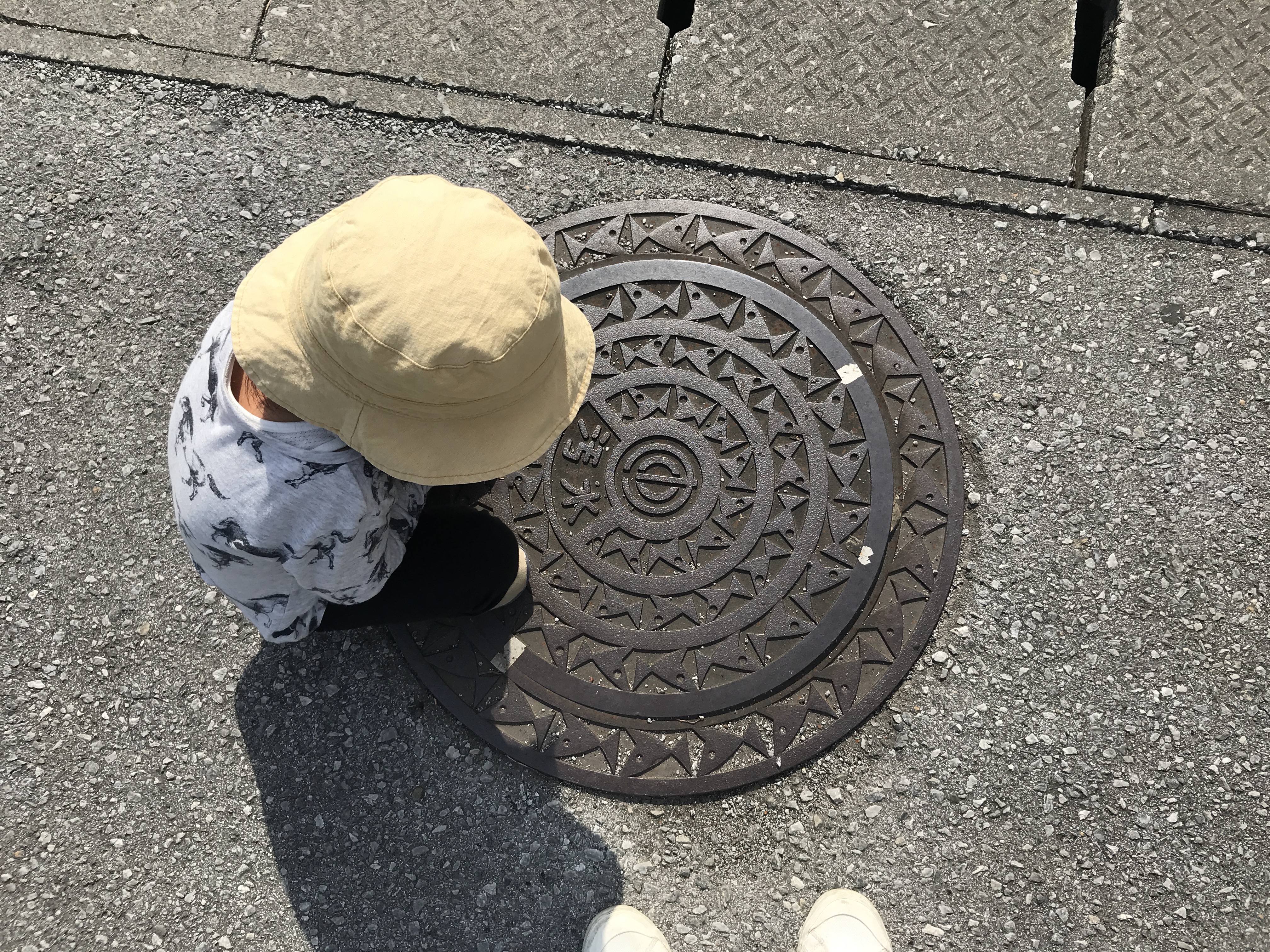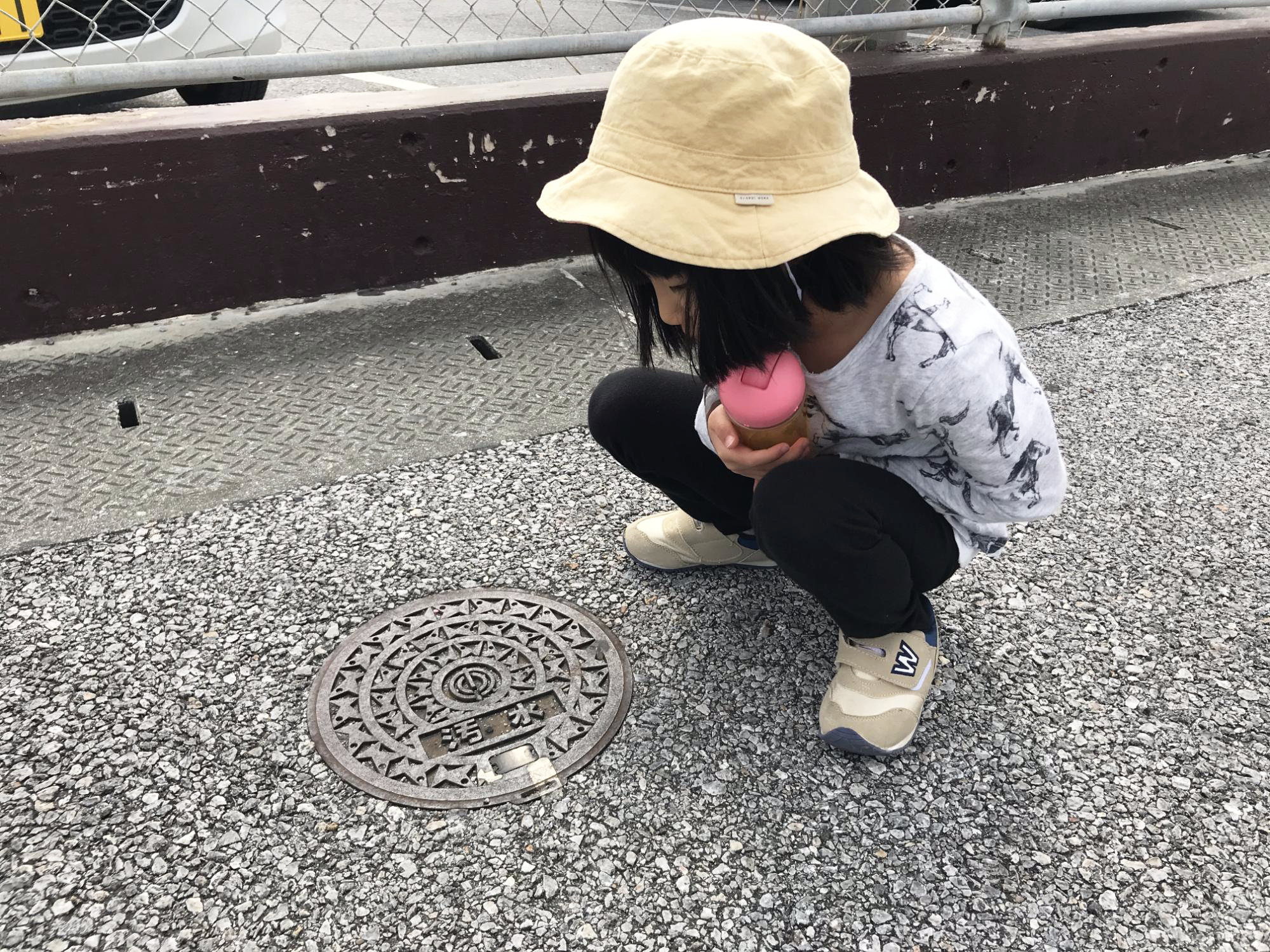 途中、ハルがマンホールの絵に夢中になりました。「お魚ですけど、リボンです」と言って座り込んで動きません。