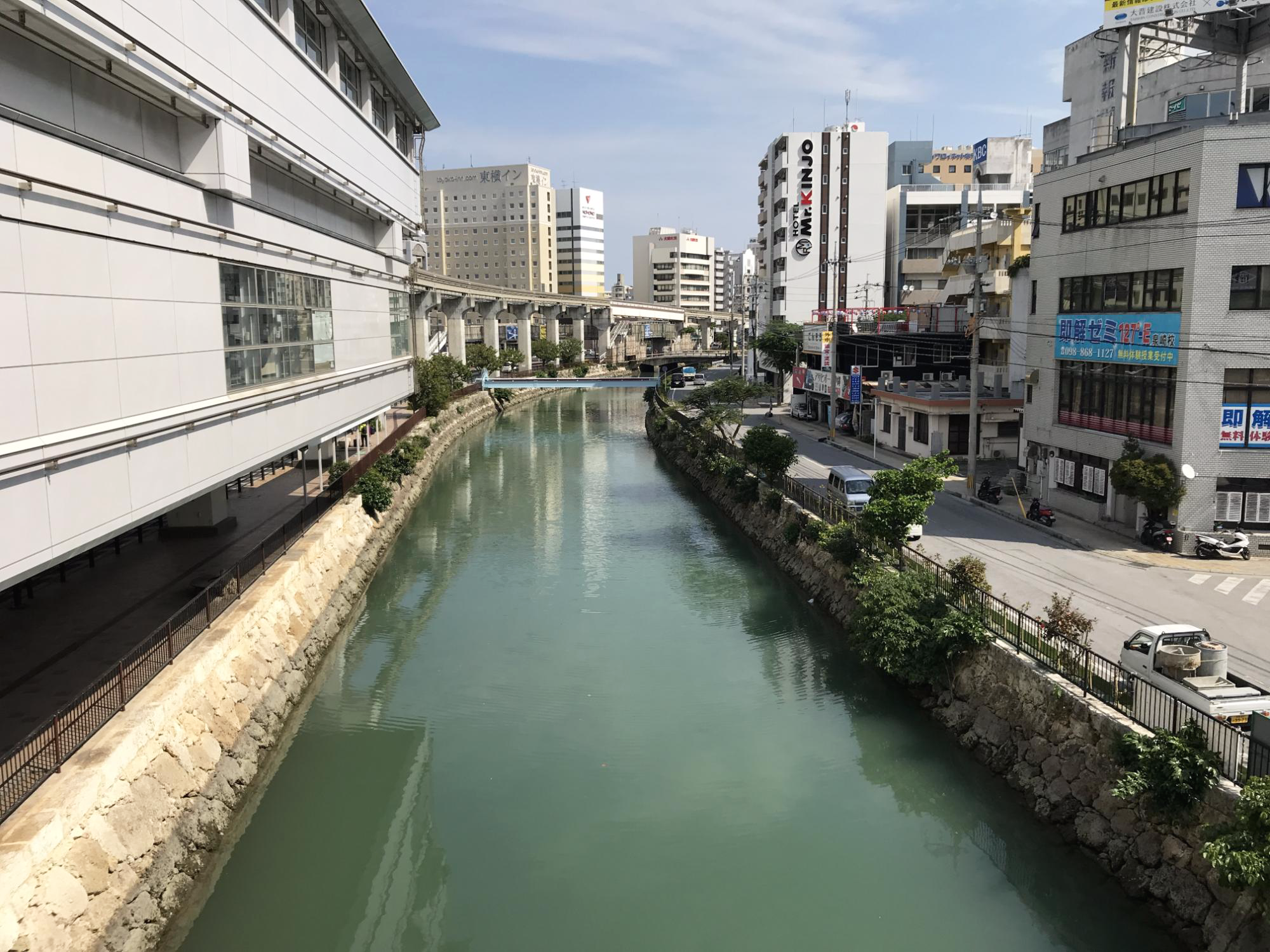 旭橋駅と久茂地川。やはり濁ってますね。流れも滞ってるし。。あとで調べたらこれでも昔に比べると水質はかなり良くなっていまは匂いもしないと。。確かに臭くはなかったです。 あ、「Mr.Kinjo in 旭橋駅前」も見えますね。