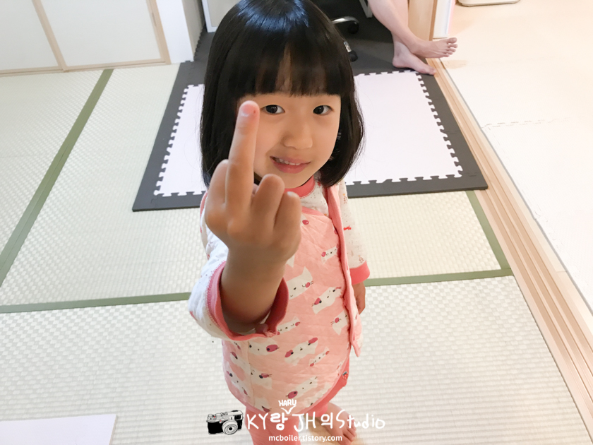아래 사진은 절~~ 대로 무언가 의도를 가지고 하는 게 아니라 가운데 손가락에 상처가 나서 엄마에게 보여주고 있을 뿐입니다.