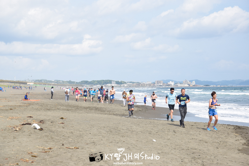이날 비치 마라톤 대회가 있어서 많은 사람들이 걷기도 힘들 모래사장을 뛰어 오고 있었습니다.