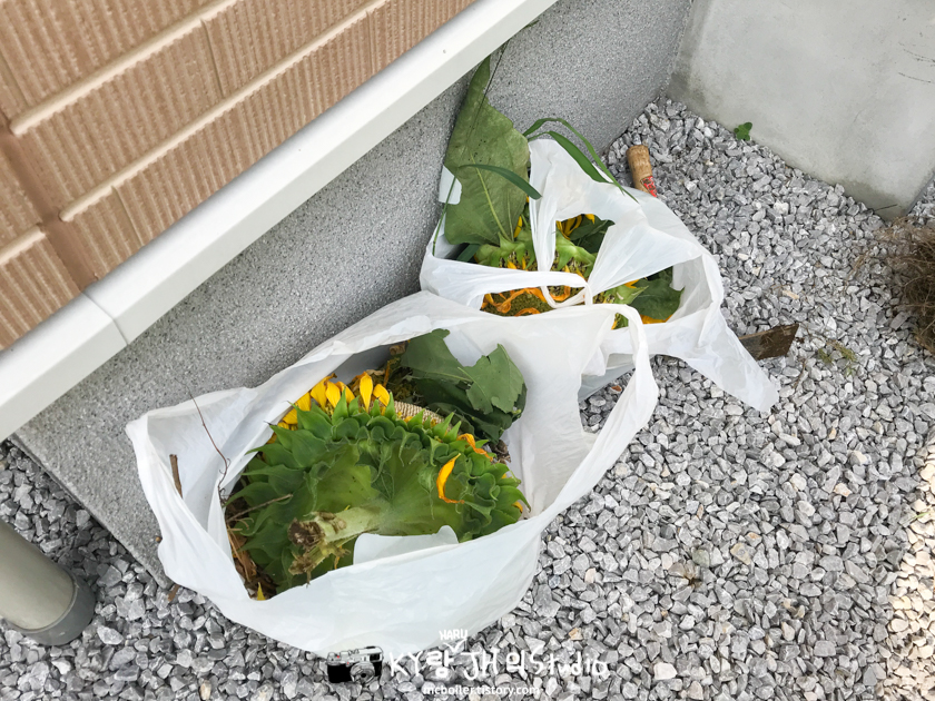 언제나 그렇듯히 해바라기도 햇볕 잘 드는 뒤뜰에서 몇일간 바싹 말린뒤에 버리기 쉬운 사이즈로 싹둑싹둑 잘라서 버렸습니다.