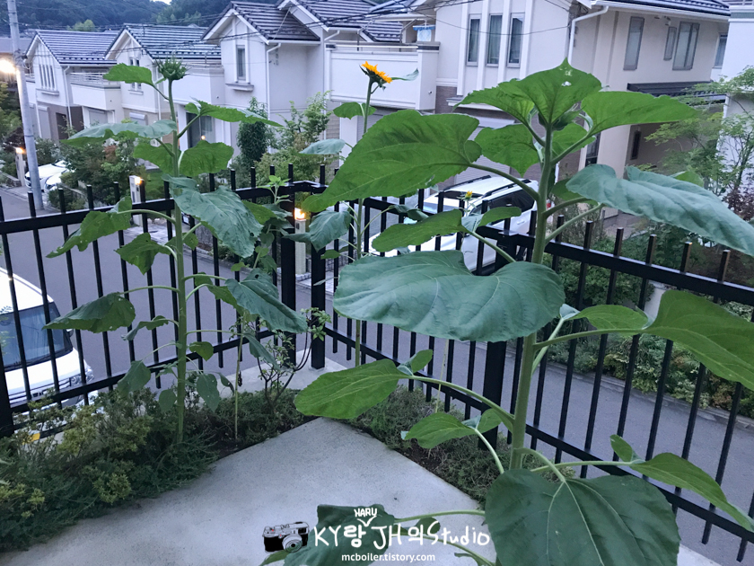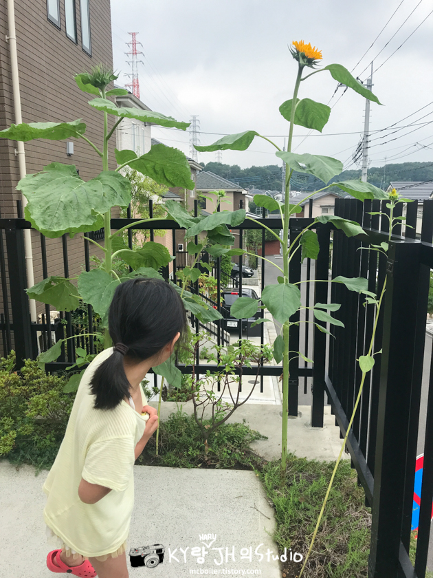 현관 앞에 옮겨 심었을때는 상상도 못 했을 정도로 엄청 키가 커버린 해바라기들.....