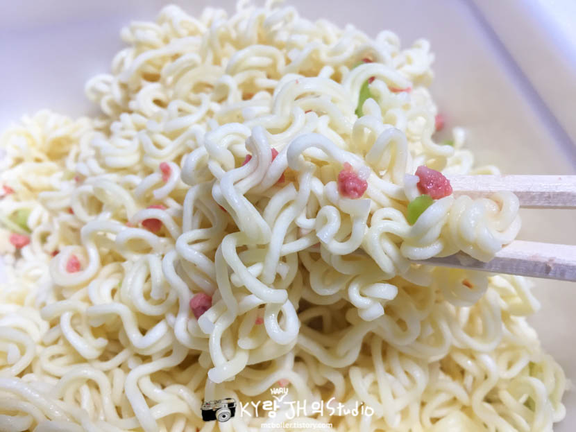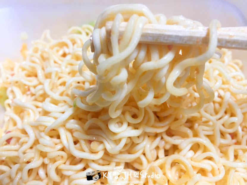 쓱싹쓱싹 비벼서 먹으면 되는데 포장지의 사진과는 달리 스프를 비비고 난 뒤에도 면의 색깔은 그다지 변하지 않았습니다.