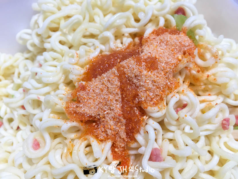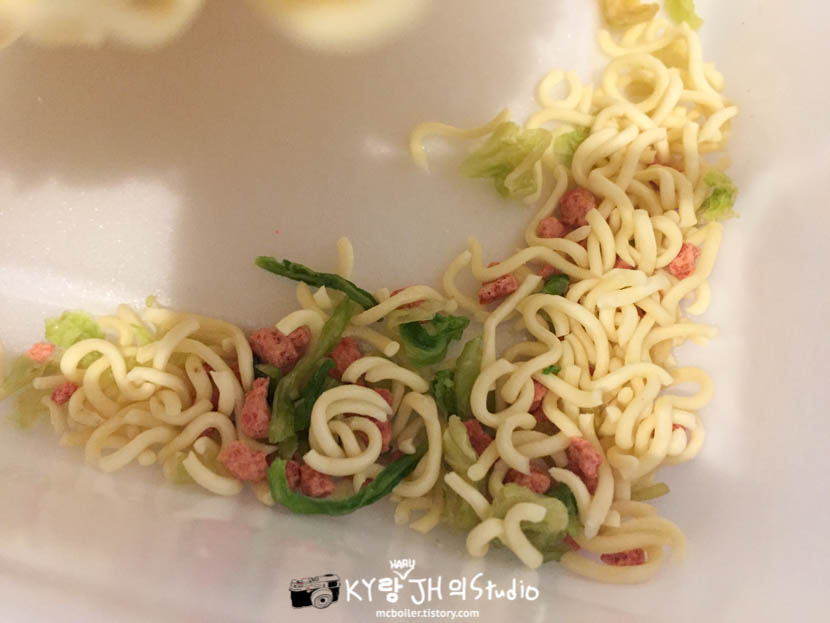 3분 뒤에 뜨거운 물을 따라내고 난 뒤에 명란젓으로 보이는 그 무언가(?)를 하나 집어 먹어 보니 딱히 아무런 맛도 안 났습니다.
