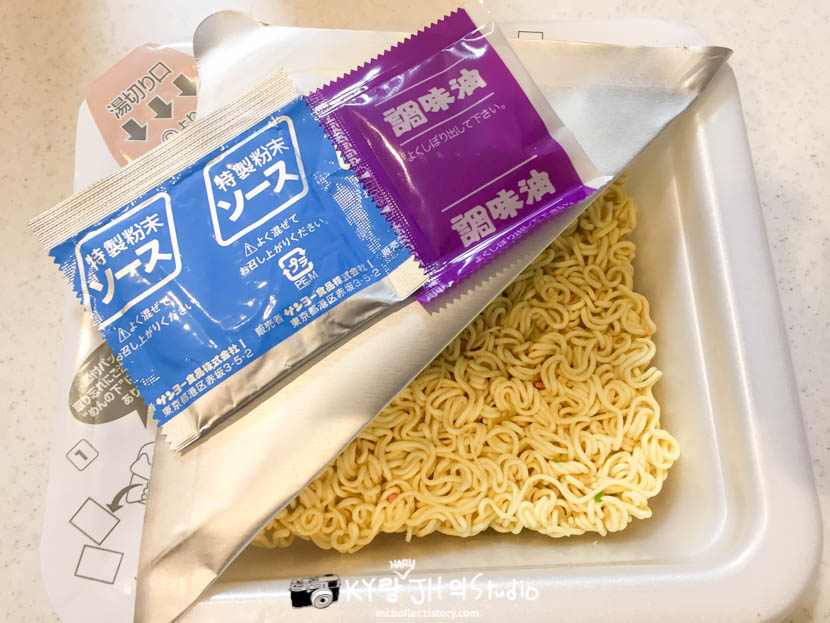 겉 포장을 벗기고 뚜껑을 열었더니 여느 야키소바계 컵라면처럼 면과 함께 분말 스프와 조미 기름(調味油)이 들어 있었습니다.