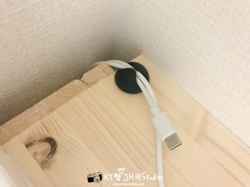 뒤쪽 구석에 있는 틈으로 핸드폰이랑 아이패드 충전 케이블을 통과 시켜서 옛날에 다이소에서 산 케이블 홀더를 달아서 케이블을 안 쓸때는