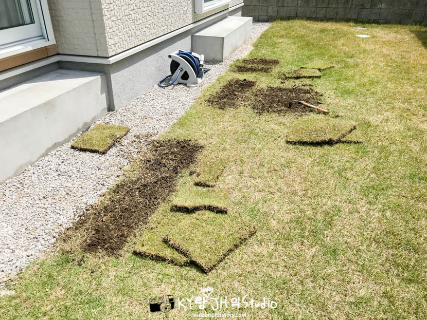 (걷어낸 잔디는 현관 앞에 옮겨 심었는데.....햇볕이 거의 안 드는 곳이라 자라기 힘들 것 같습니다.)
