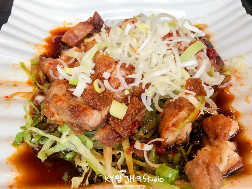 바싹 튀긴 닭고기에 고추기름으로 맛을 낸 건지 조금은 매콤하면서도 짭조름하고 시큼한 양념과 함께