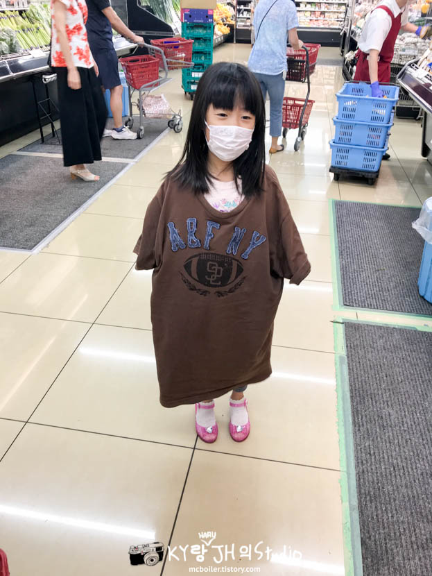 그런데 슈퍼의 냉방이 추웠는지 계속 춥다고 해서 제가 입고 있던 티셔츠를 벗어서 입혀 줬더니 거의 원피스 수준이네요. ㅎㅎㅎ