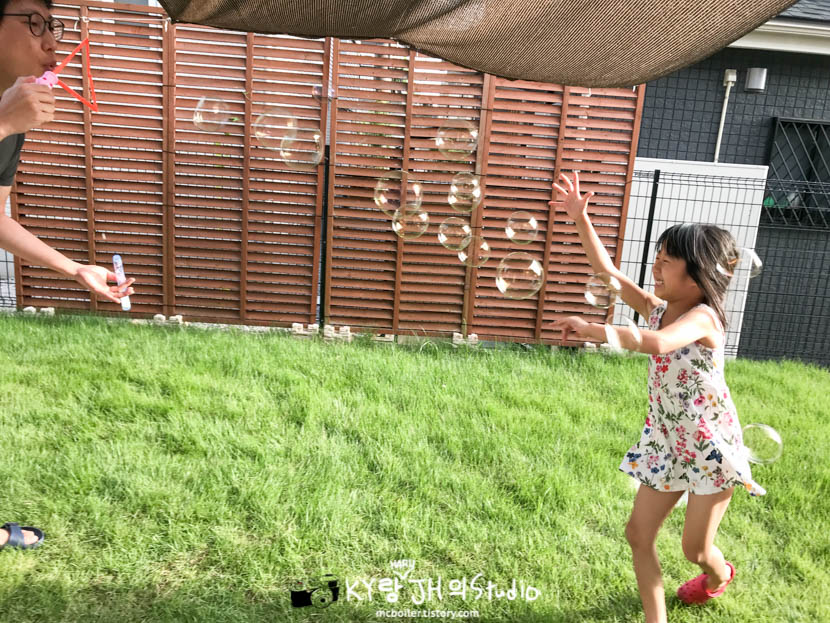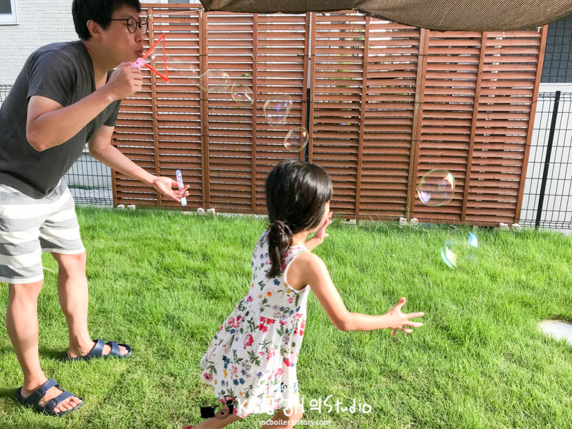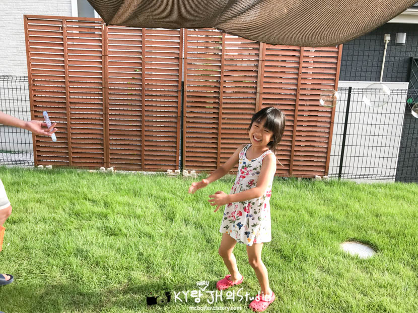 날씨가 좋았던 주말 오후에는 뒤뜰에서 비눗방울 놀이를 했는데~
