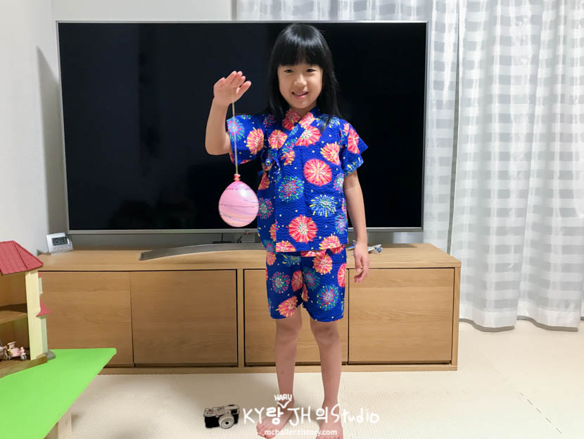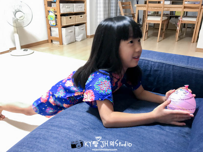 어떻게 하면 하루가 조금이라도 여름을 즐길 수 있을까 하다가 집에서 마츠리를 열어 주기로 하고 불꽃놀이를 사 와서 뒤뜰에서 불꽃 놀이도 하고 마츠리에서 뽑기로 주는 요요도 사와서 만들어 줬습니다.