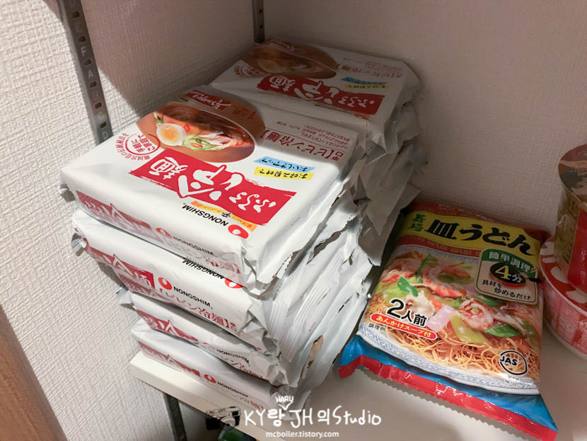 슈퍼에서 둥지 냉면 10개를 사 가지고 와서 식료품 창고에 이쁘게 쌓아 두었더니 마음이 든든했습니다.