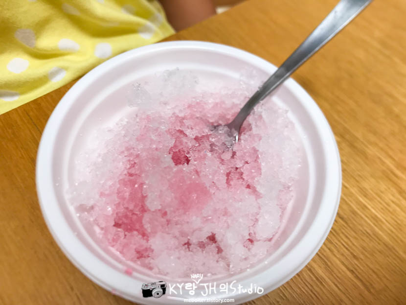 이것 때문에 빙수기를 사도 몇 번 안 해 먹을 것 같아서 집에서 야채 채 썰기에 얼음을 넣고 돌리고 슈퍼에서 사 온 시럽을 뿌려줬더니