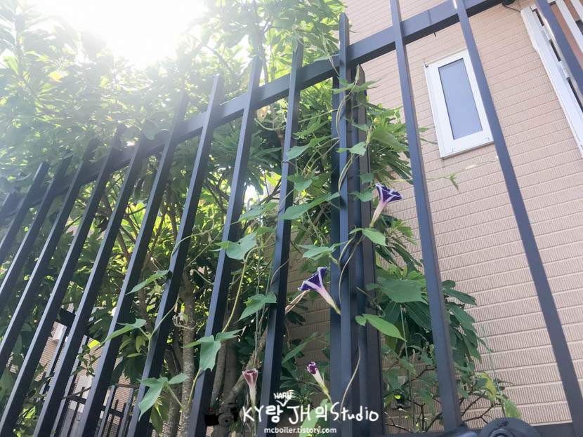 아무튼 그렇게 부쩍부쩍 자란 나팔꽃들은 줄기들이 점점 펜스를 타고 올라가기 시작하더니 이제는 펜스를 넘어서 현관 앞 나뭇가지를
