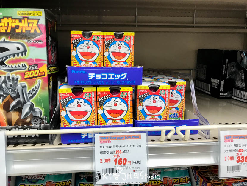 달걀 같은 초코렛 안에 도라에몽 인형이 들어 있는데 슈퍼에서는 160엔에 팔고 있습니다.