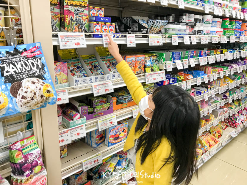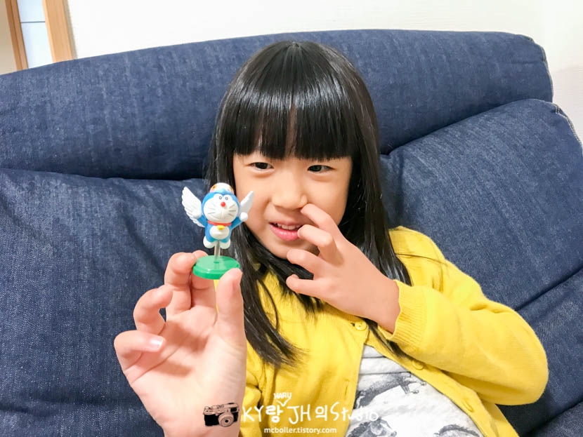 주말에 오코노미야키를 먹고 집으로 돌아가는 길에 슈퍼에 들려서 하루가 요즘 좋아하는 도라에몽 초코렛을 사줬습니다.