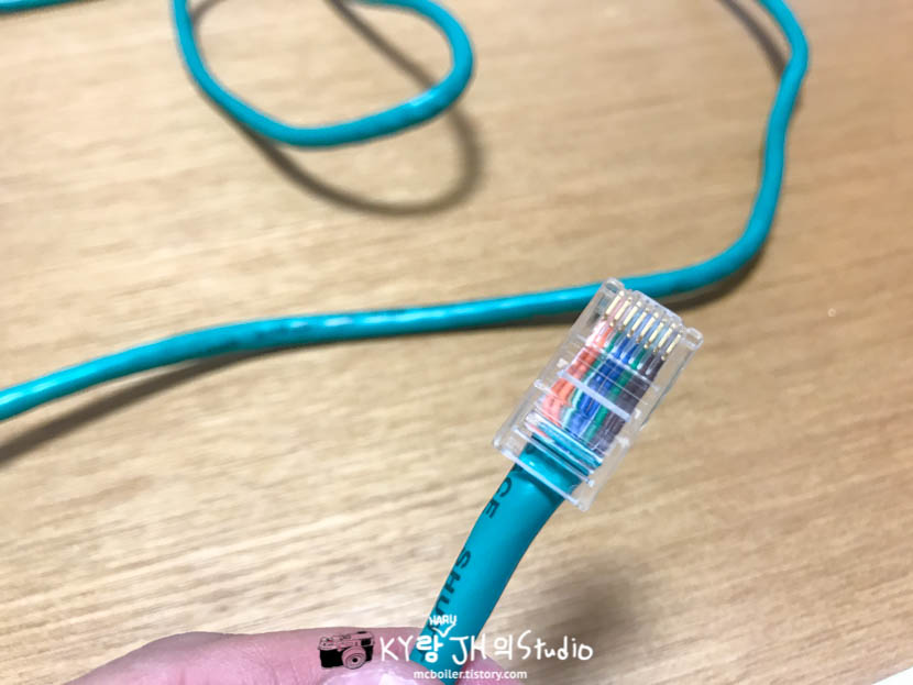 우선 연습 삼아 랜 케이블의 커넥터를 교체 해 보기로 하고 녹슨 커넥터 부분은 잘라내고 8가닥 케이블을 커넥터에 위치 맞춰서 넣은 뒤에
