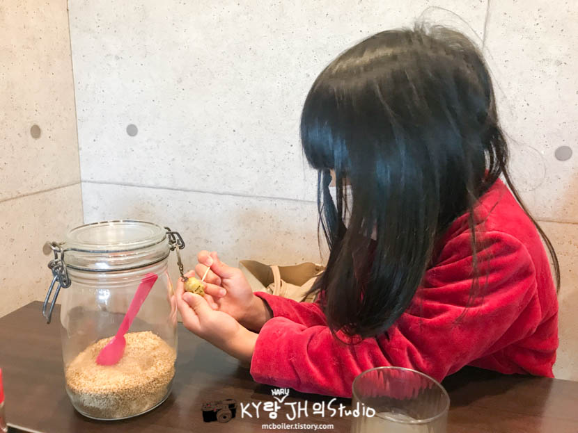 라멘을 기다리는 동안 하루는 참깨가 담긴 통에 달린 해골 장식을 이쑤시개로 찔르면서 놀고 있었습니다. ^^;;