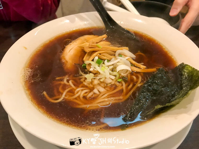 우선 카요가 주문한 생강 간장 라멘이 먼저 나왔는데 스프 색깔이 엄청 진해서 깜짝 놀랐습니다.