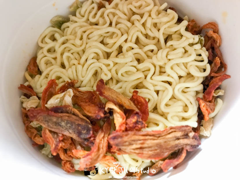 포장지를 뜯어서 안을 들여다 보니 면은 지금껏 보아 왔던 신라면 컵라면에 들어있는 면과 동일해 보였는데 건조 김치가 생각보다 많이