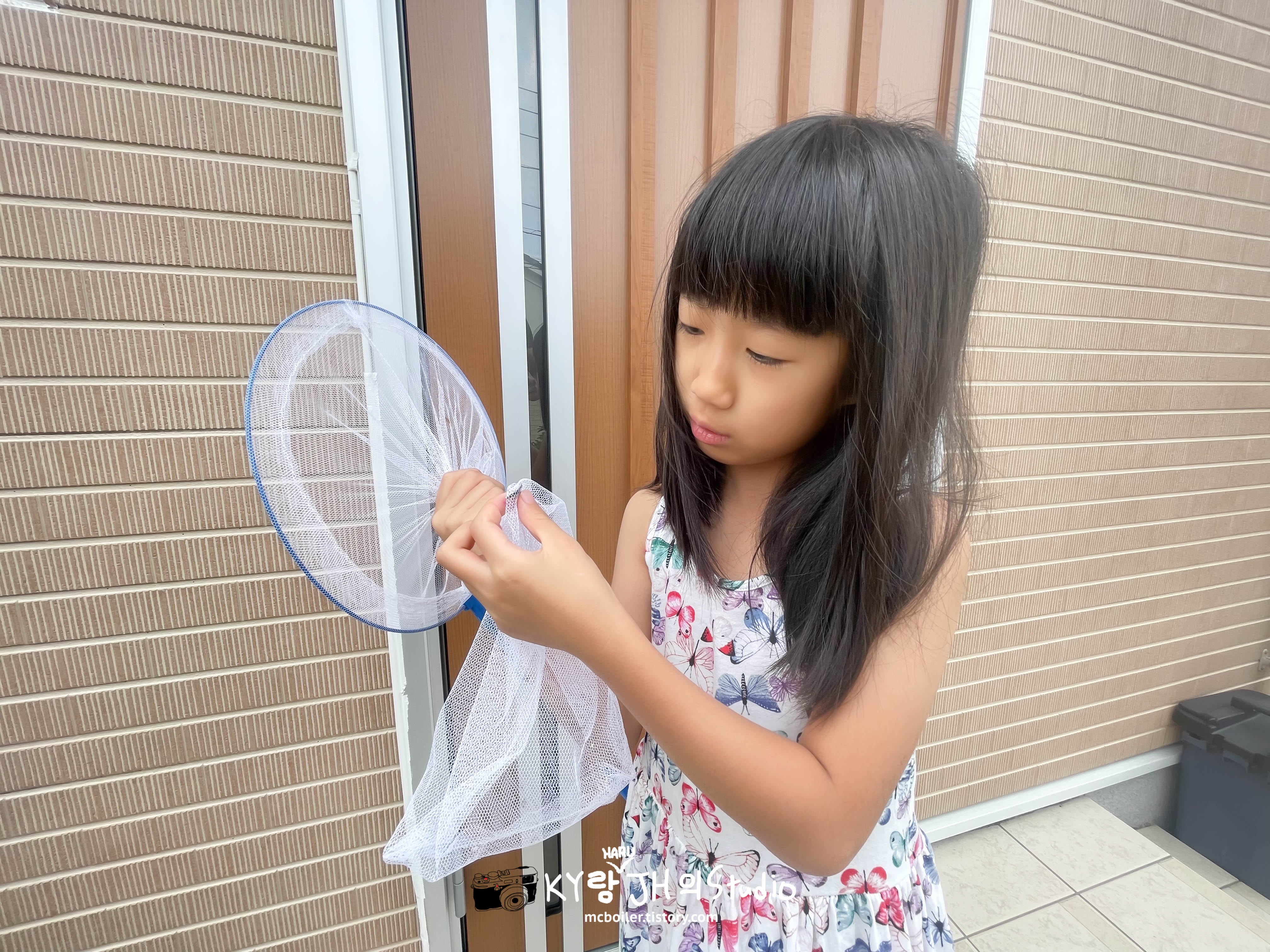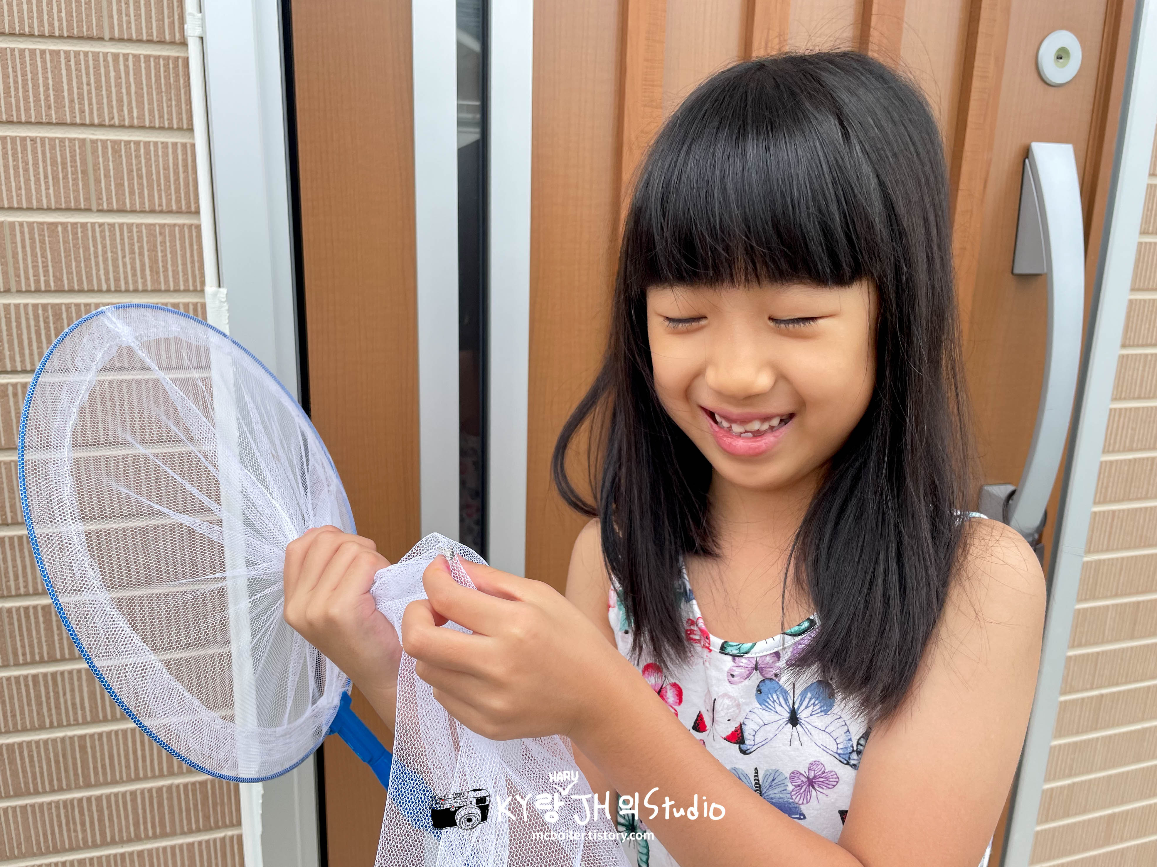 하루가 현관 앞에서 나비를 작은 나비 한마리를 잡았습니다