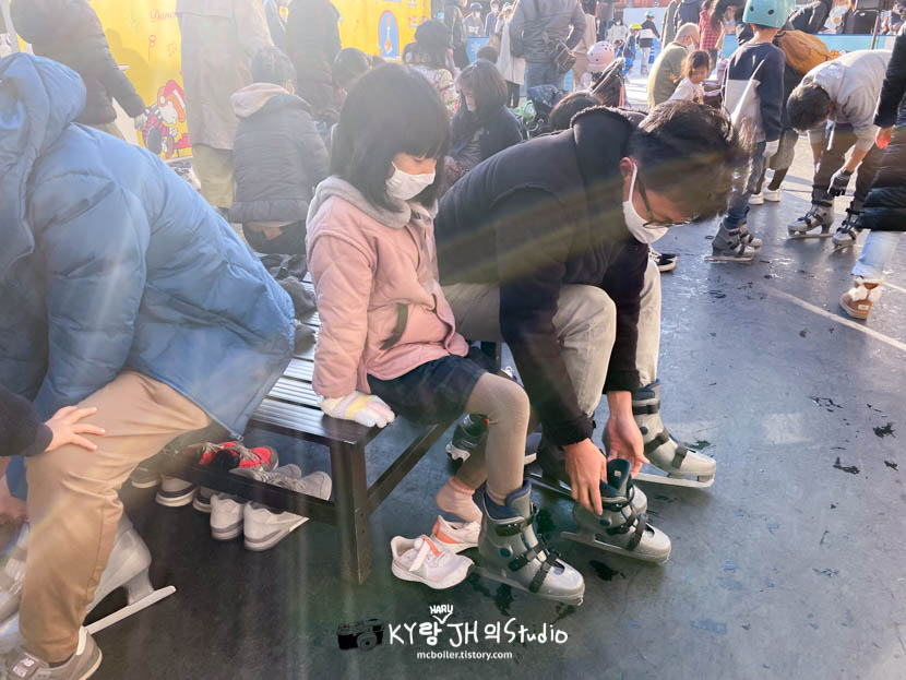 잠시 줄을 서서 티켓을 사고 들어가서 스케이트화를 빌려서 신고 스케이트장으로 들어갈 준비를 했습니다.