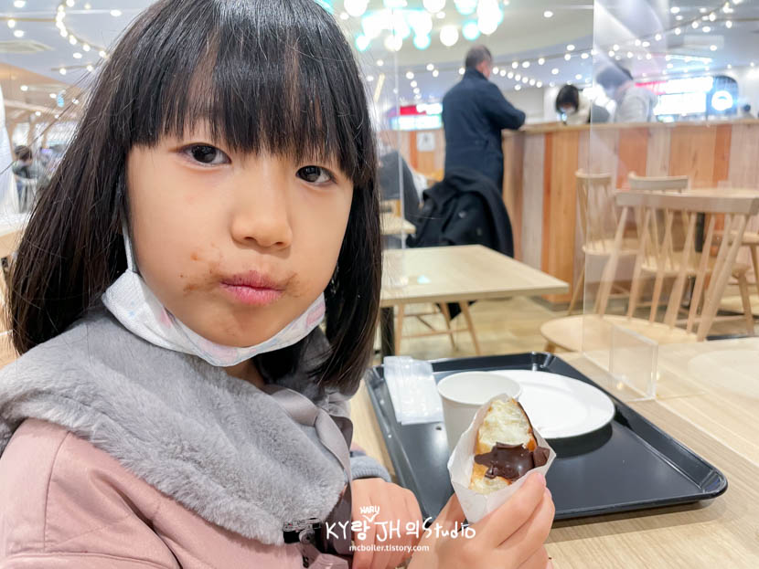스케이트장을 나와서 쇼핑몰 안에 있는 푸드코트에서 간단히 밥을 먹었는데 하루는 감자튀김과 초코 도너츠를 먹었는데