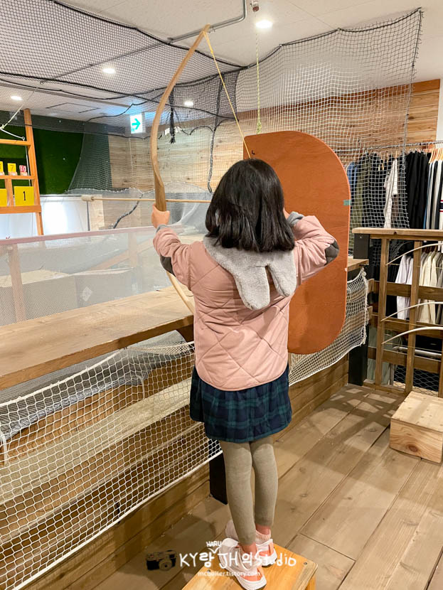 그리고 하루가 예전부터 활쏘기 한번 해보고 싶다고 했었기에 집으로 돌아가기 전에 마지막으로 활쏘기를 경험해 볼 수 있는 쇼핑몰 안의 아웃도어 전문점에 잠시 들렸습니다 (1,000엔을 주고 코인 4개를 구입한 뒤에 코인 2개를 지불하면 활 10개를 쏴 볼 수 있습니다)