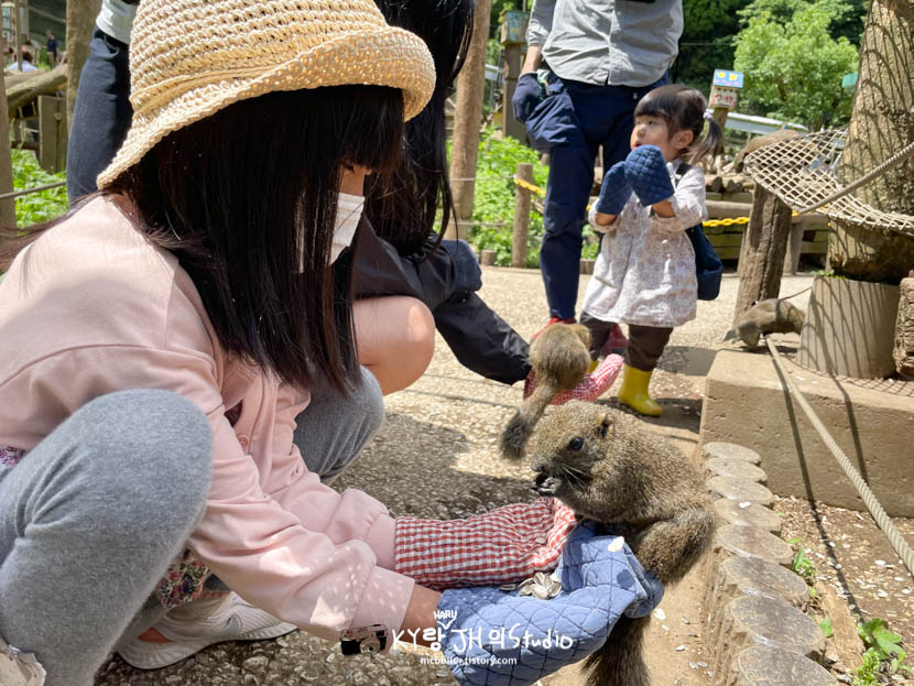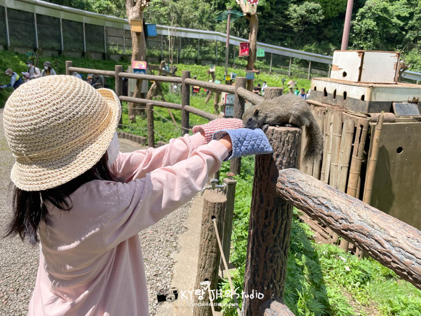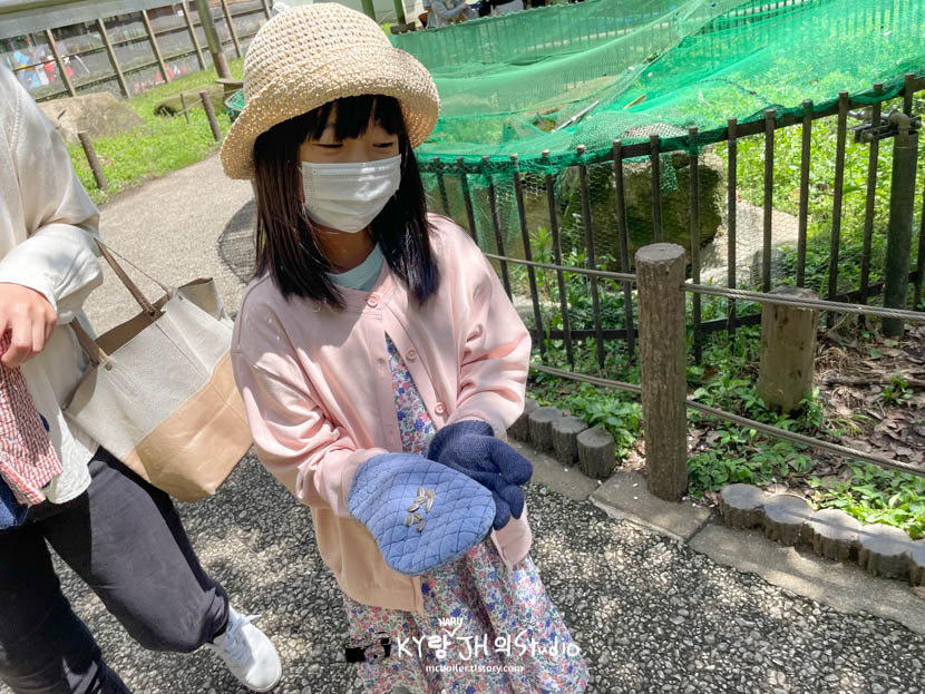 동물에게 먹이 주는걸 정말로 좋아하는 하루. 모이(100엔)를 샀더니 벙어리장갑을 빌려 줬습니다