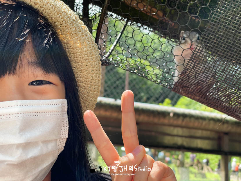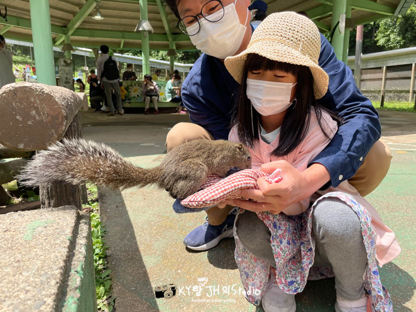 뒤에 있는 여자아이처럼 모이를 먹는 다람쥐를 찾으면 차례를 기다려야 할 정도로 거의 모든 다람쥐가 모이를 봐도 다가오지 않았습니다.