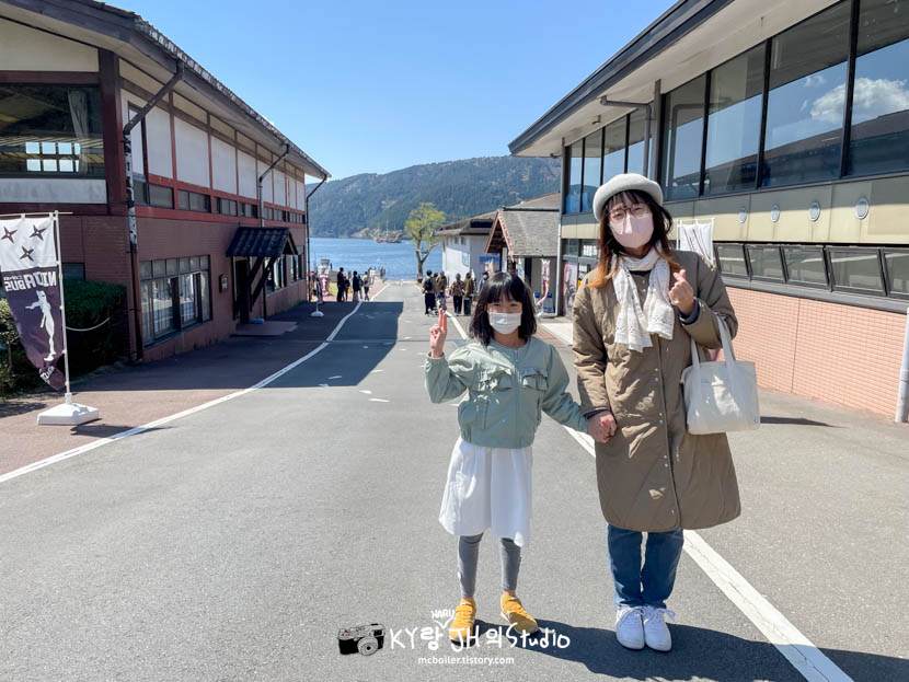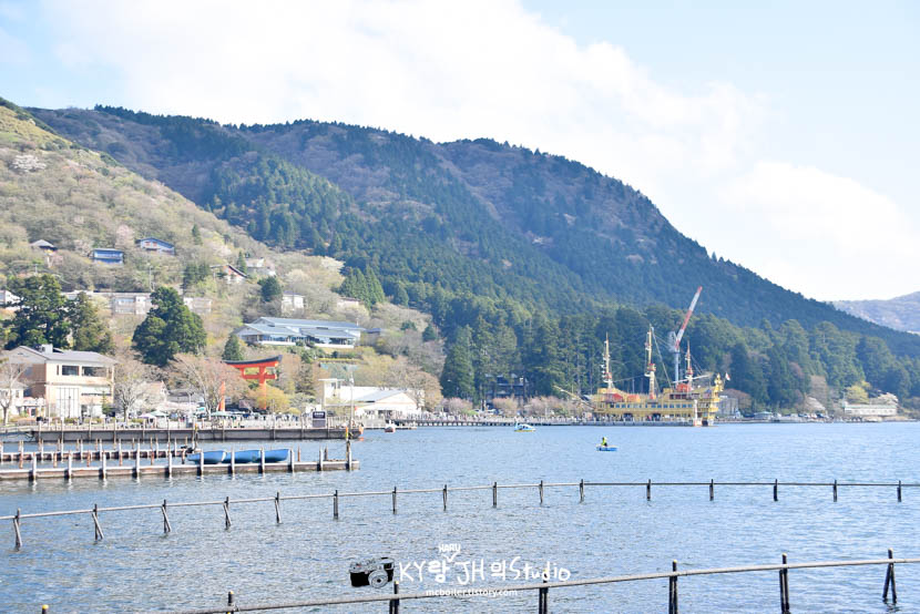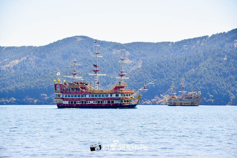 그러게 간단히 점심도 먹고 기념품 가게도 구경하고 난 뒤에 다시 동물랜드로 돌아가는 길에 아시노코(芦ノ湖)의 유람선이 보이길래
