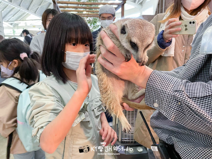 미어캣은 사육사분이 안고 있는 걸 쓰다듬어 볼 수 있었는데 뭔가 해탈한 듯한 표정의 미어캣의 표정이 재미있었습니다