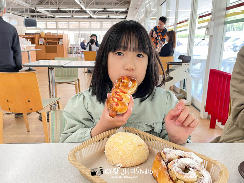 가게마다 사람들이 줄을 길게 늘어서 있고 하루가 먹을 만한 게 없어서 빵을 팔고 있는 곳에서 간단하게 점심을 먹기로 했습니다.
