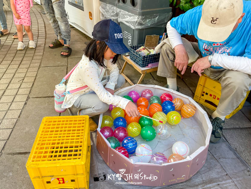 잠시 물도 마시고 휴식을 할 때 물풍선 요요 뽑기를 하고 싶다고 해서 시켜 줬는데