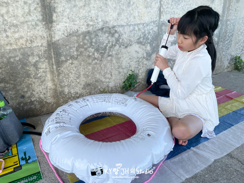 우선은 다리 밑에서 옷을 갈아입고 튜브에 공기를 넣었습니다. 이 튜브와 공기 주입기는 도쿄에서 가져왔습니다.