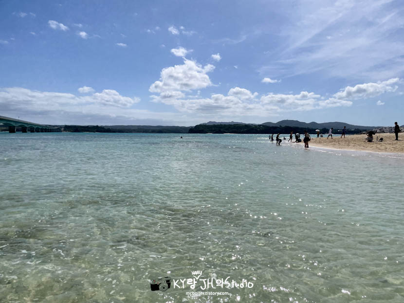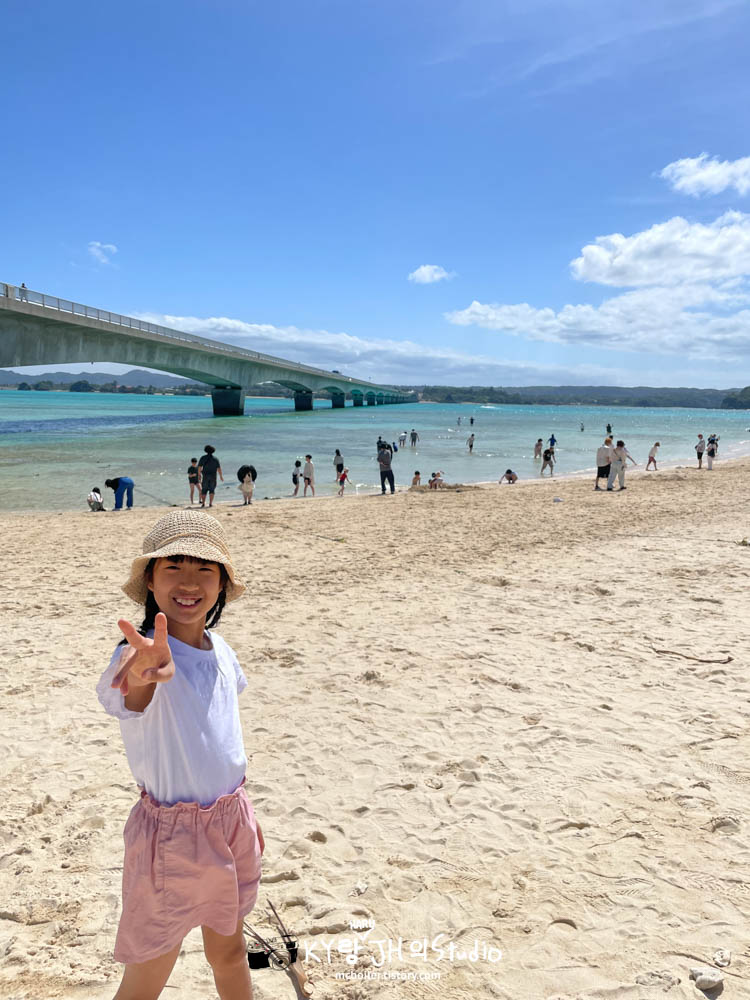 파란 바다와 하얀 모래사장 그리고 올 때 건너온 코우리 대교를 볼 수 있는 뷰 스팟 입니다.