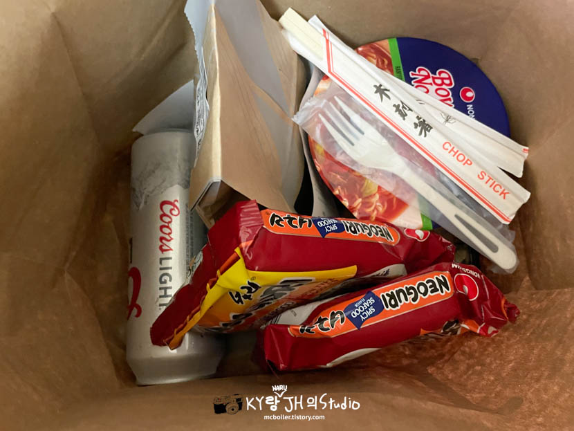 하와이에 도착 후 첫끼인데 3명 모두 먹고 싶은 걸 산 결과... 한국 라면과 치킨이랑 맥주...
