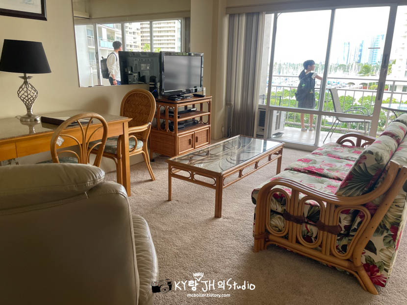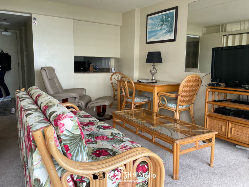 방안은 꽤 오래된 분위기였습니다. 아빠의 회사가 소속된 단체는 이 콘도에 3개의 방을 가지고 있는데 그중에 가장 레트로한 방은 배정받았습니다😅 그래도 3명이서 1박에 2만엔(소비세 포함) 정도로였기에 하와이의 숙박지로써는 파격적인 가격이었습니다.
